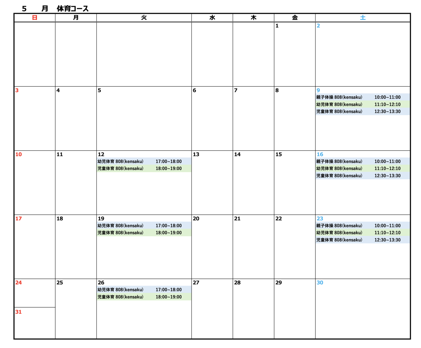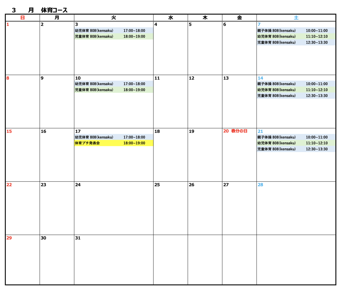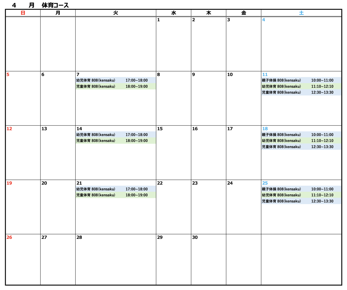 ※土曜日の体育クラス:10月の振替レッスンを1月に行いますので、1月は4回レッスンとなります。