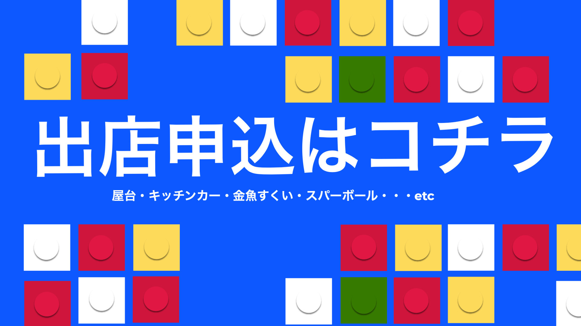 区画が限られているため、参加申込は1店舗につき2区画までとし、予定区画数に達した時点で締め切らせて頂く場合がございます。
